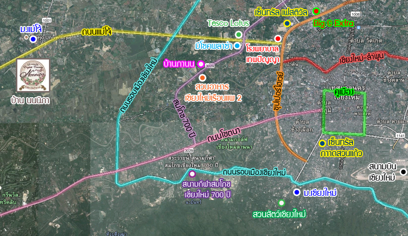 | สถานที่สำคัญใกล้เคียง | 1. มหาวิทยาลัยแม่โจ้ - 1.0 กม. 2. เทสโก้ โลตัส - 9.0 กม. 3. มีโชคพลาซ่า, ตลาดรวมโชค - 9.0 กม. 4. บ้านภานน, สวนอาหารเชียงใหม่เรือนแพ 2 - 11.0 กม. 5. โรงพยาบาลเทพปัญญา - 10.2 กม. 6. เซ็นทรัลเฟสติวัล – 11.3 กม. 7. Big C Extra - 12.0 กม. 8. สนามกีฬาสมโภชเชียงใหม่ 700 ปี - 15.5 กม. 9. เซ็นทรัลกาดสวนแก้ว – 16.4 กม. 10. มหาวิทยาลัยเชียงใหม่ - 16.8 กม. 11. สวนสัตว์เชียงใหม่ - 17.8 กม. 12. สนามบินเชียงใหม่ – 22.0 กม. |